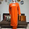 Elegant rust-orange 2-piece Karandi outfit, beautifully designed with delicate tilla embroidery work. The kurta features graceful embroidery on the neckline, while the sleeves, side panels, and trouser hem are enhanced with intricate tilla borders. A timeless design that blends tradition with elegance.
