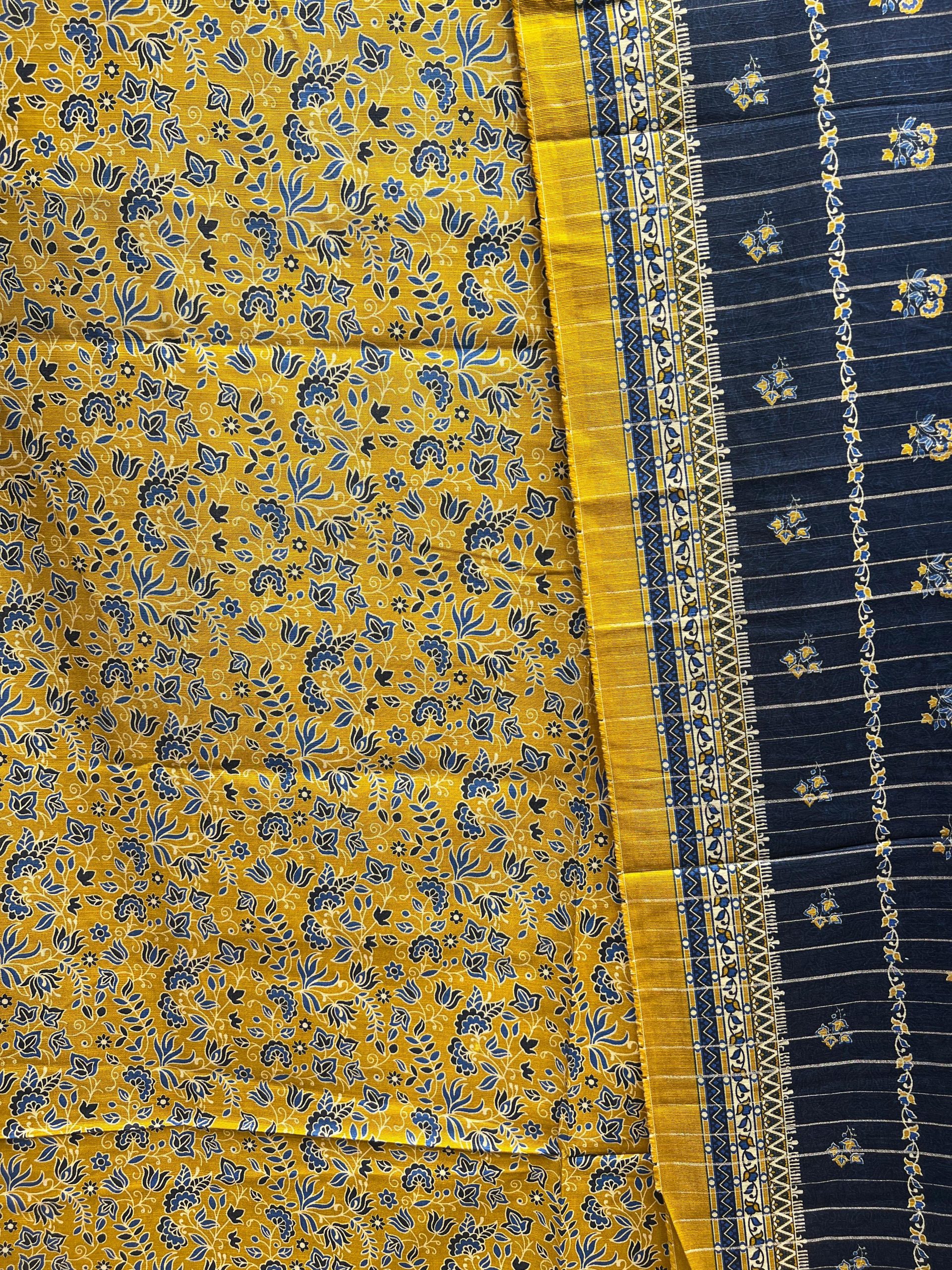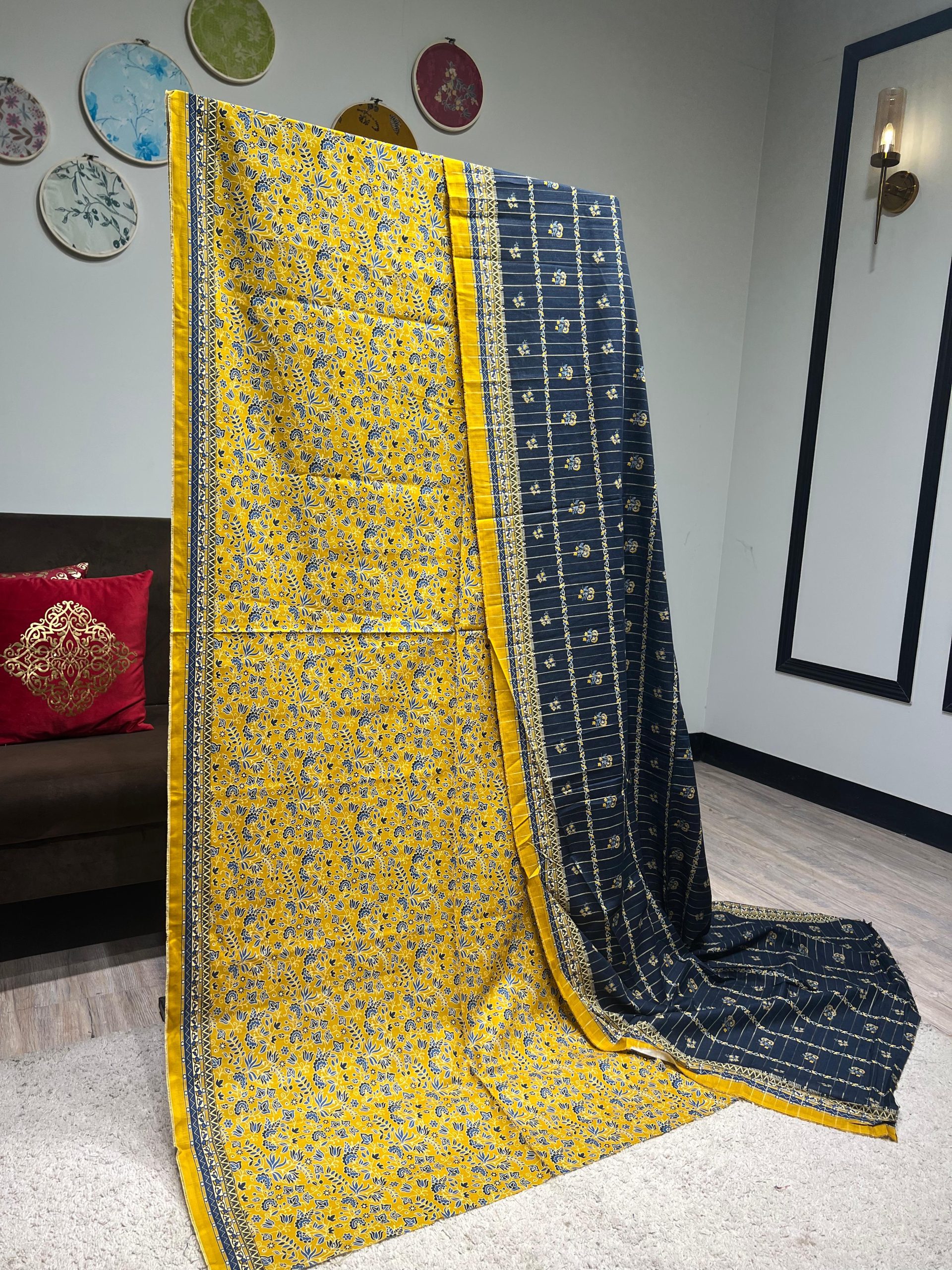Dupatta: Contrasting navy blue khadar dupatta with linear and floral patterns, beautifully bordered with yellow for a striking finish.