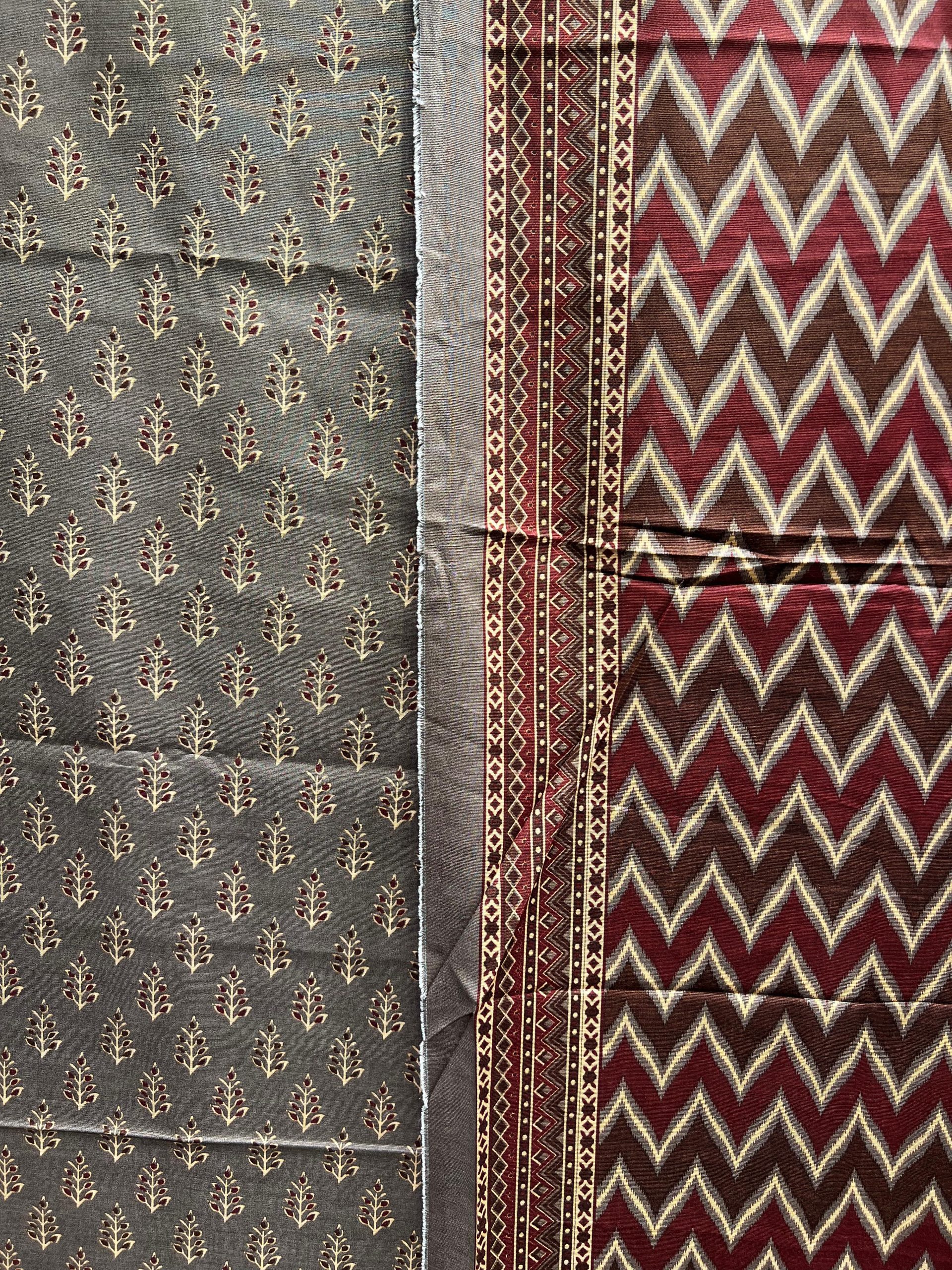 Make a bold style statement with this 3-piece digital printed khadar suit in a rich maroon colour. Designed with a modern twist, it blends motifs print and zigzag patterns for a chic winter look.